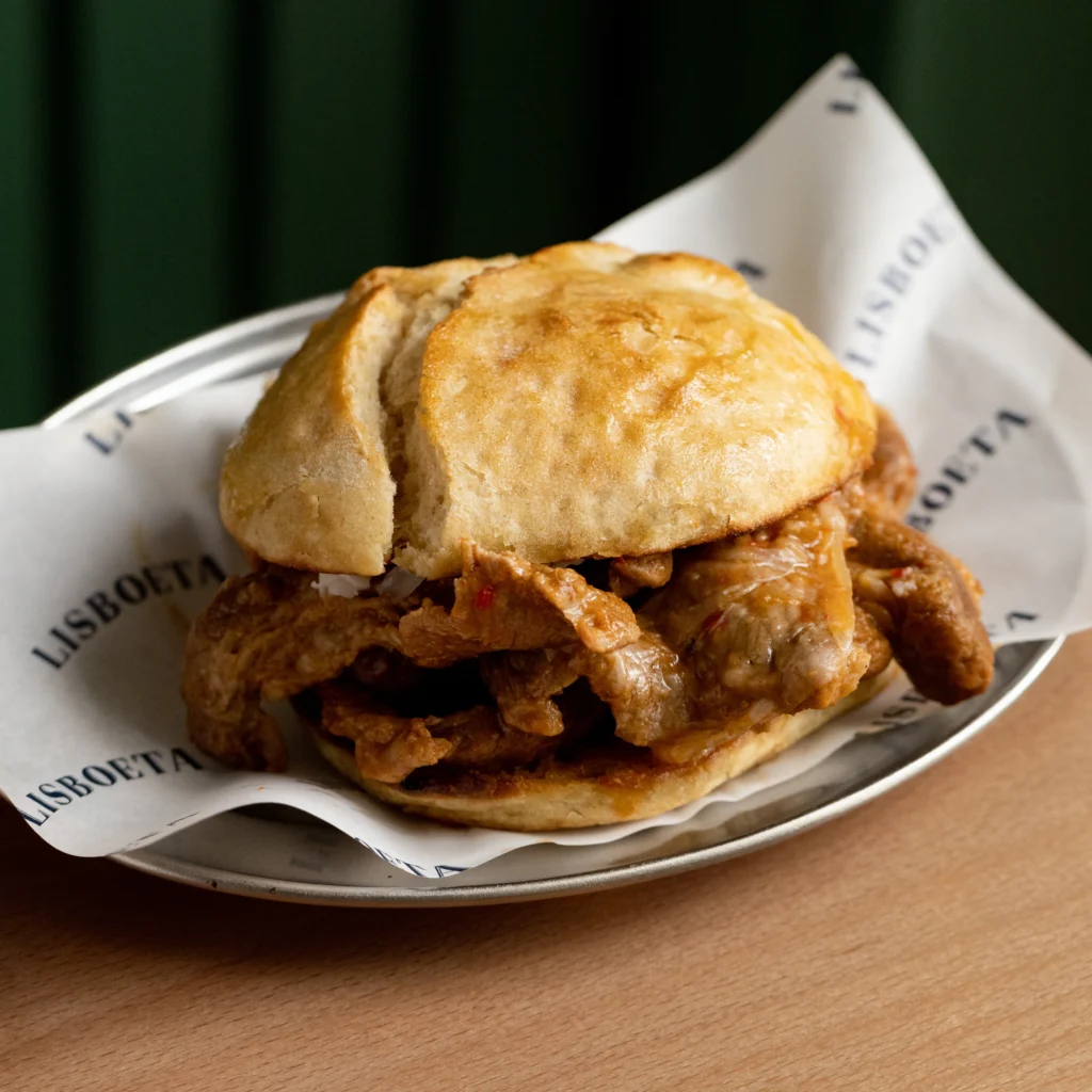 Pork sandwich in spicy sauce.