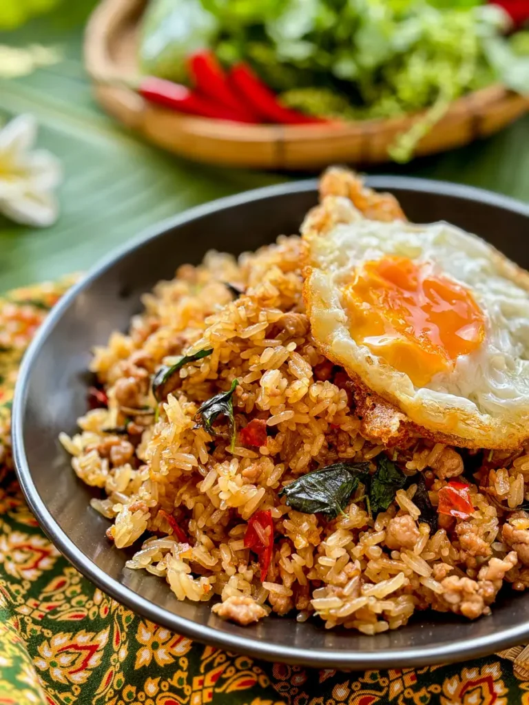 Holy basil stir-fry with minced pork, garlic, chilies, topped with fried egg.