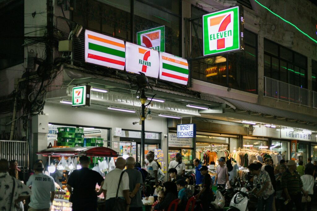 7-Eleven everywhere, perfect for grabbing snacks, SIM cards, drinks; open 24/7 for quick essentials